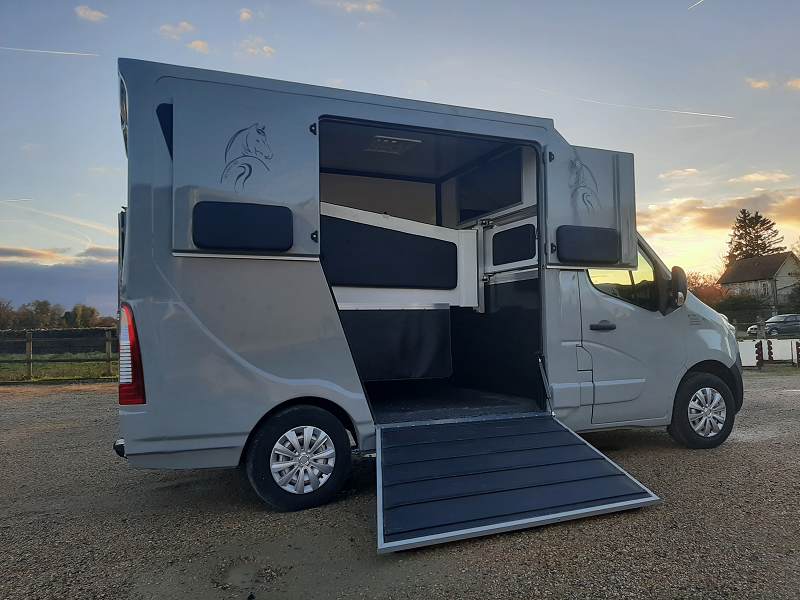 | - Description : | Renault Master III - L2 grand confort – 130 cv – 146 000kms – 02/2018 Partie Cabine : • 3 places • Caméra de recul et habitacle • Clim Partie chevaux : • Montée latérale, pont caoutchouc et 2 volets supérieurs • Poitrail et retour avec anneau d’attache et retour • Séparation de tête amovible • Coussins latéraux et fessiers • Bas flanc pivotant et démontable avec bavette • 2 vitres coulissantes 600/400 sur cotés latéraux • 1 Aérateurs de toit • Eclairage habitacle chevaux commandé depuis la cabine • Sol en caoutchouc • Caoutchoucs latéraux • Crochet d’attelage • 2 anneaux d’attache extérieurs Garantie mécanique 6 mois et équipement 1 an TVA récupérable |